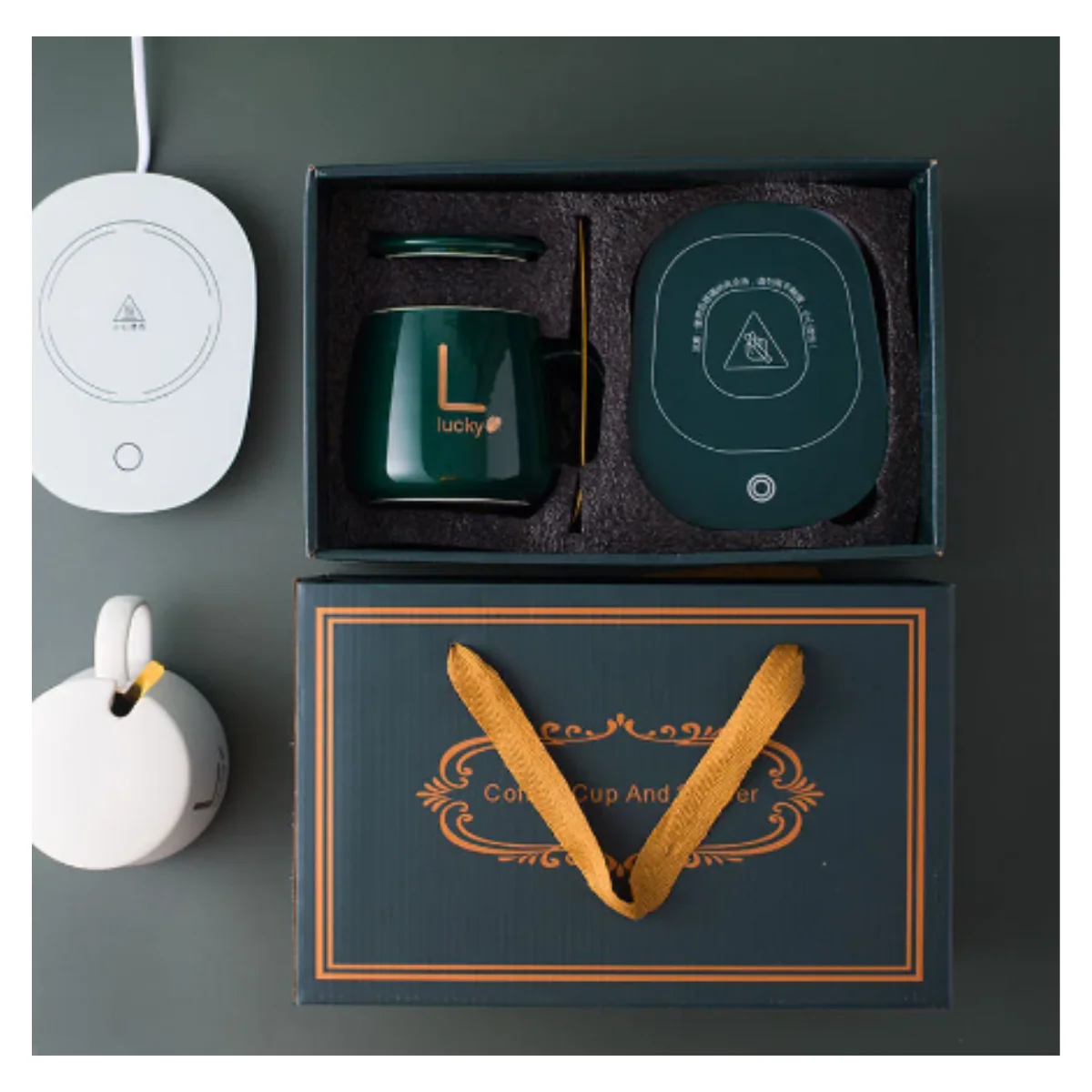 Este elegante set incluye una taza con tapa, cucharita y base calefactora que mantiene tu café, té, leche o cualquier bebida caliente a la temperatura ideal.